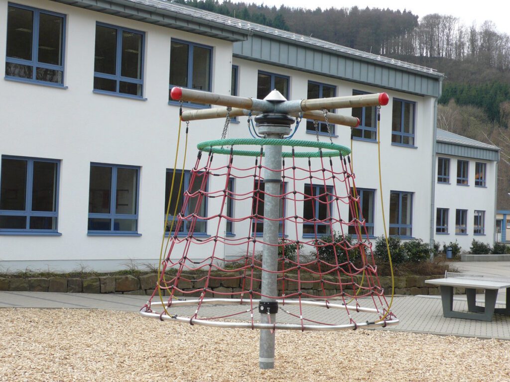 Climb around on this one! The unit rotates and bounces and sways! Circular net up to a rope wound round with rope at the top!