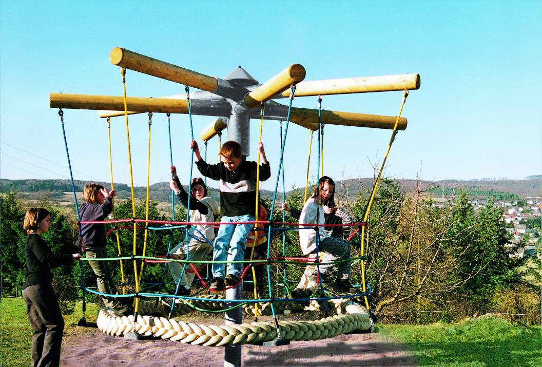 The Run Around is a rotating climbing tower-carousel with a difference! Chunky rope around the base with vertical ropes to climb up.