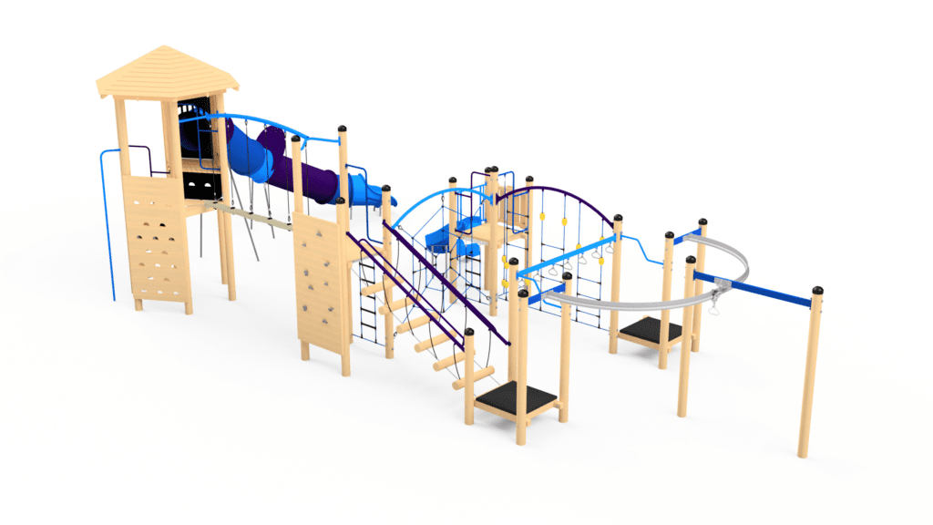 This awesome hex tower connects to a second module via a jungle rope bridge, packed with play equipment- rock walls, hanging rings, whisper glide, tube slide, spider web net, inclined log bridge and so much more!