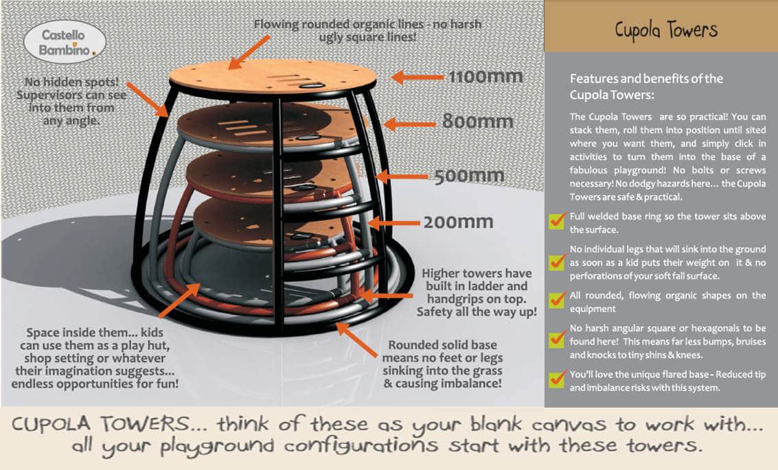 Ultra practical, Stackable Towers that compliment the environment with beautiful curved design. Also the BASE of every Bambino Moveable Playground System. 300mm & 500mm models also available.