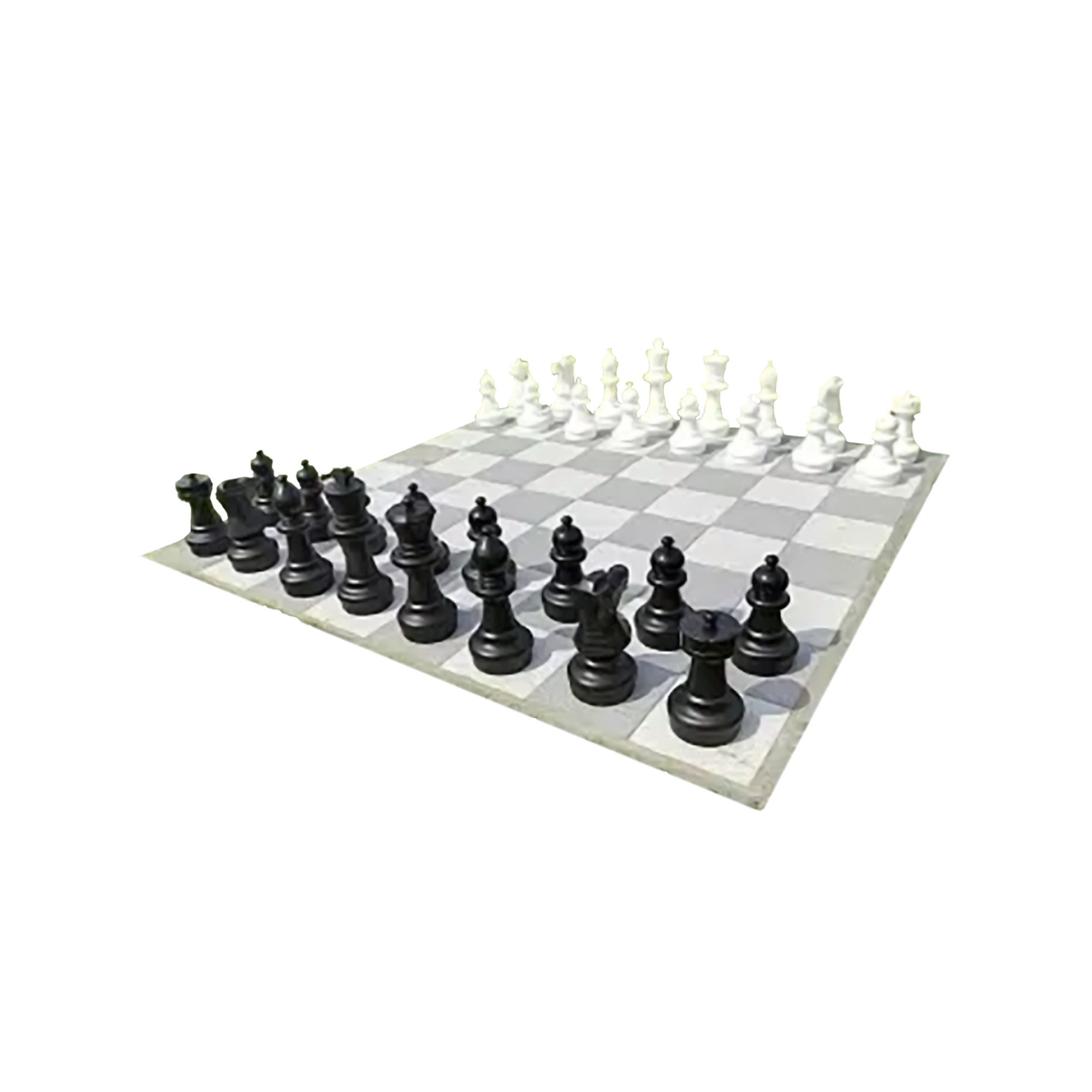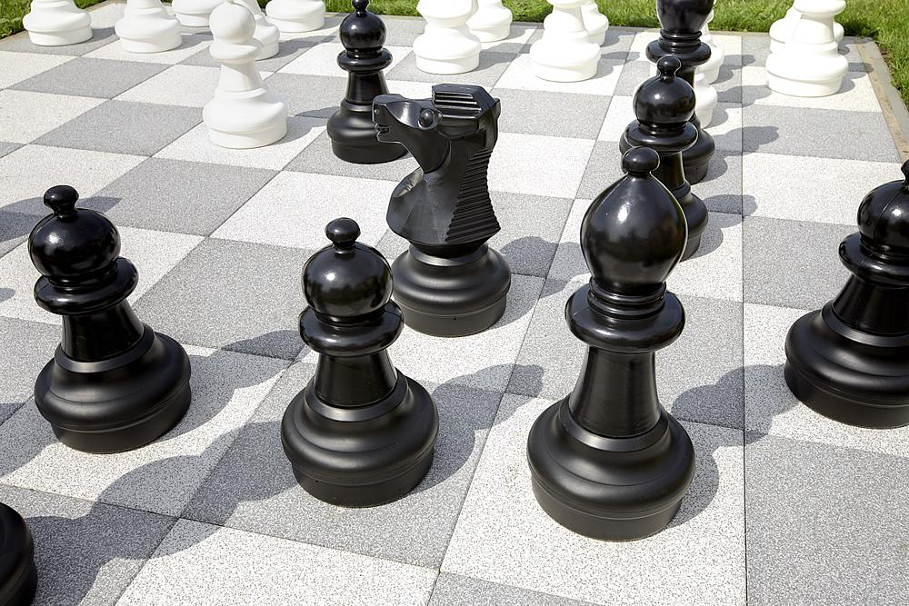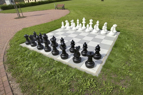 Chess Board consisting of weatherproof, polyester tiles 35x35cm each.  These are fitted together to form a 2.8×2.8m large board.