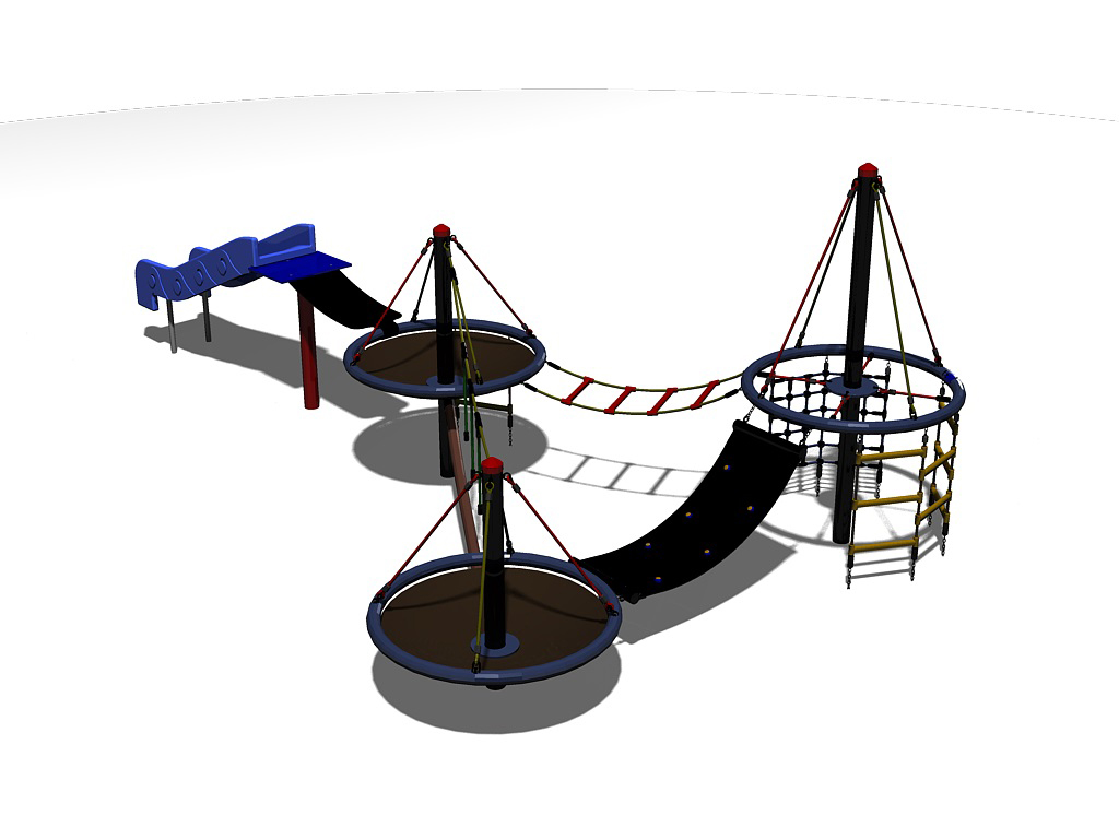 Fun, compact play unit with Nest Baskets & Ring wound round with rope, connected with different play elements – with an added bridge & slide.