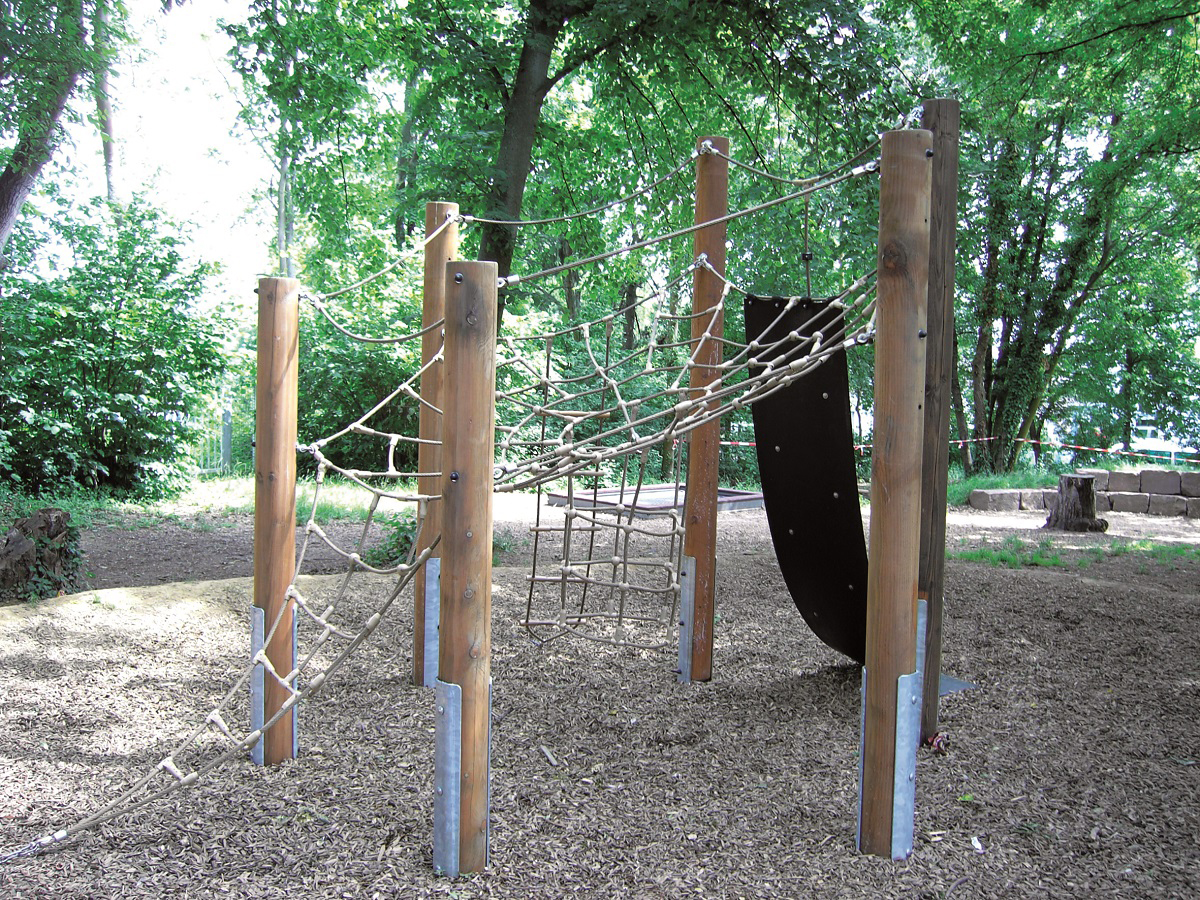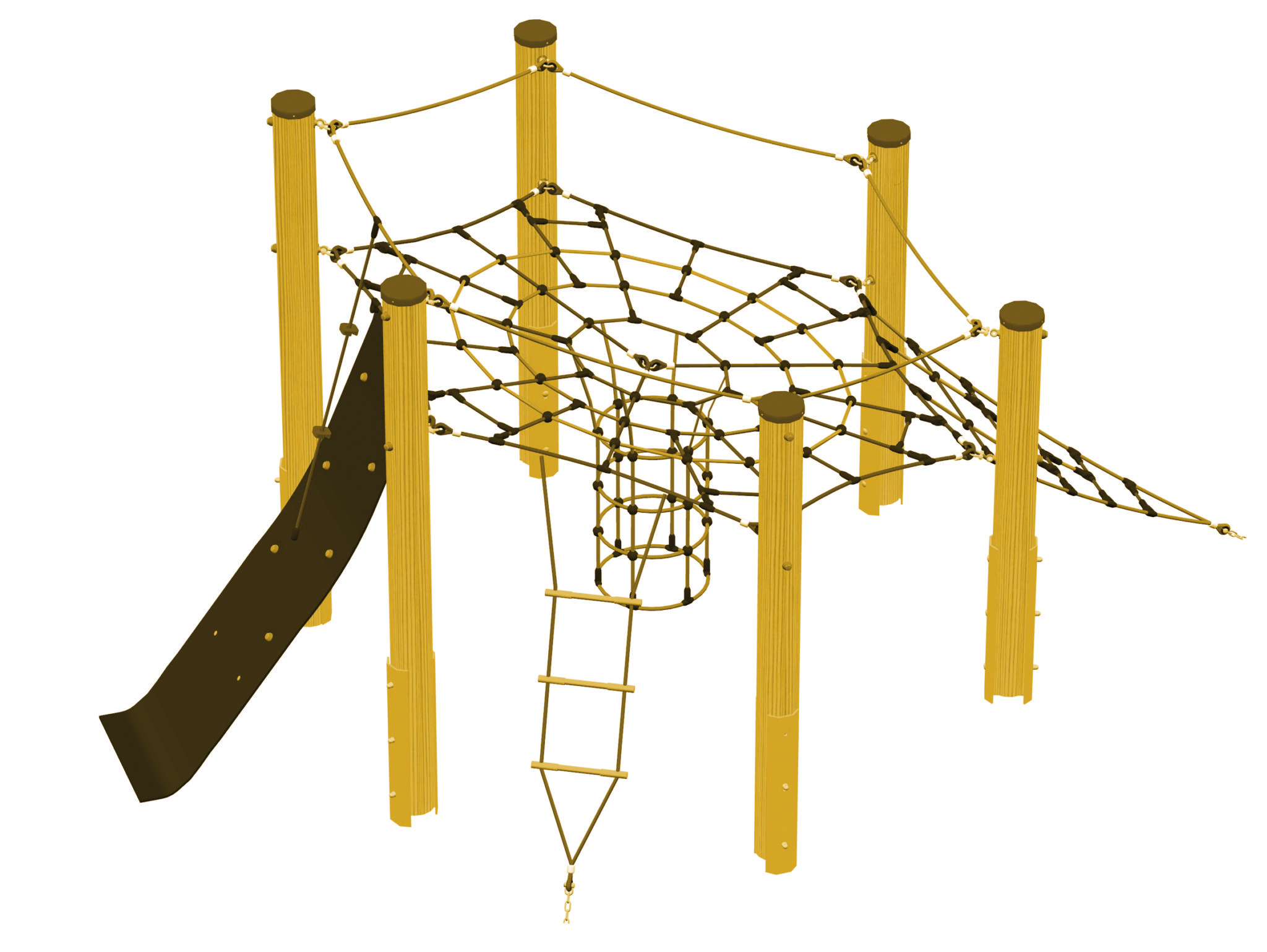 Funky unit with spider-web net hung on a slanting angle, with access up or down via the climbing chimney, rope ladder, rubber membrane belt or triangle climbing net!! Total height 2.7m.