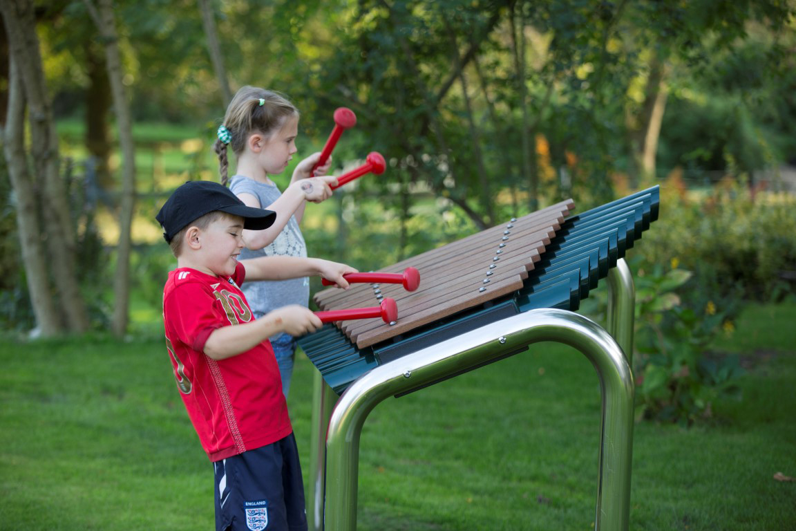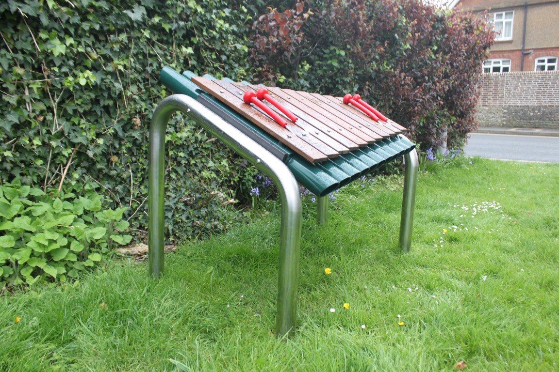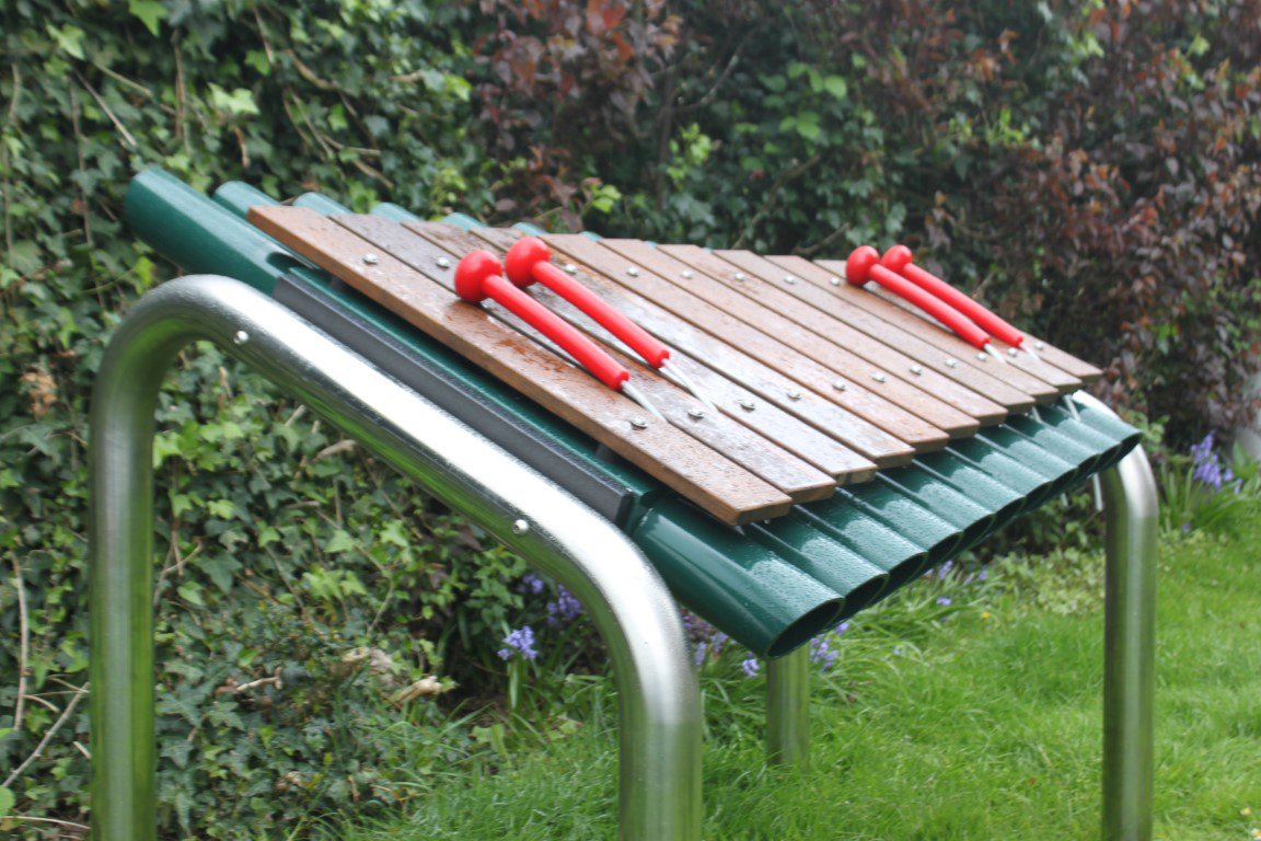 A substantial outdoor musical instrument that produces a strong, deep & resonant sound. Accessible to all, the height, angle and space underneath the instrument are such that a wheelchair user can enjoy playing the instrument comfortably. Spans two octaves.