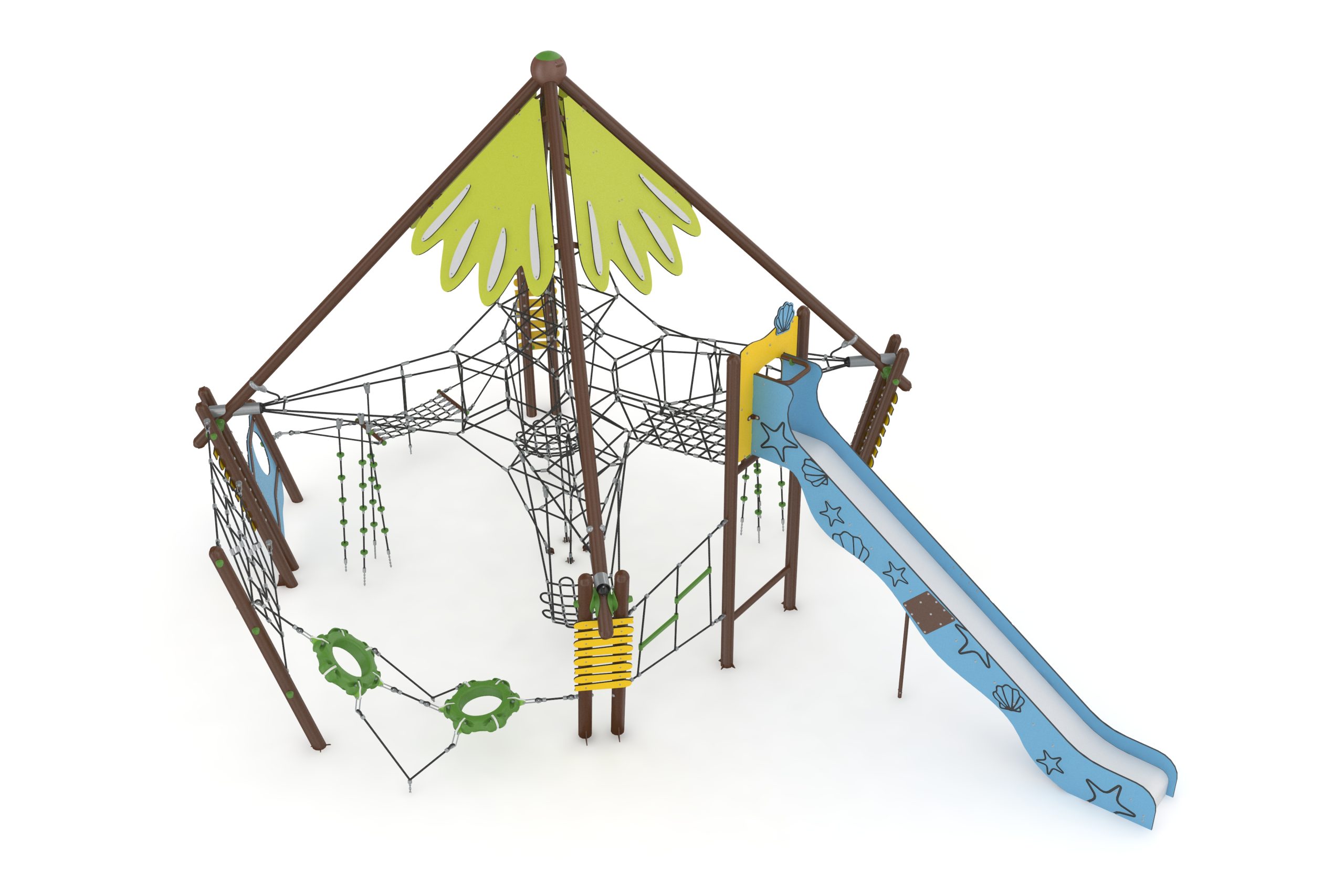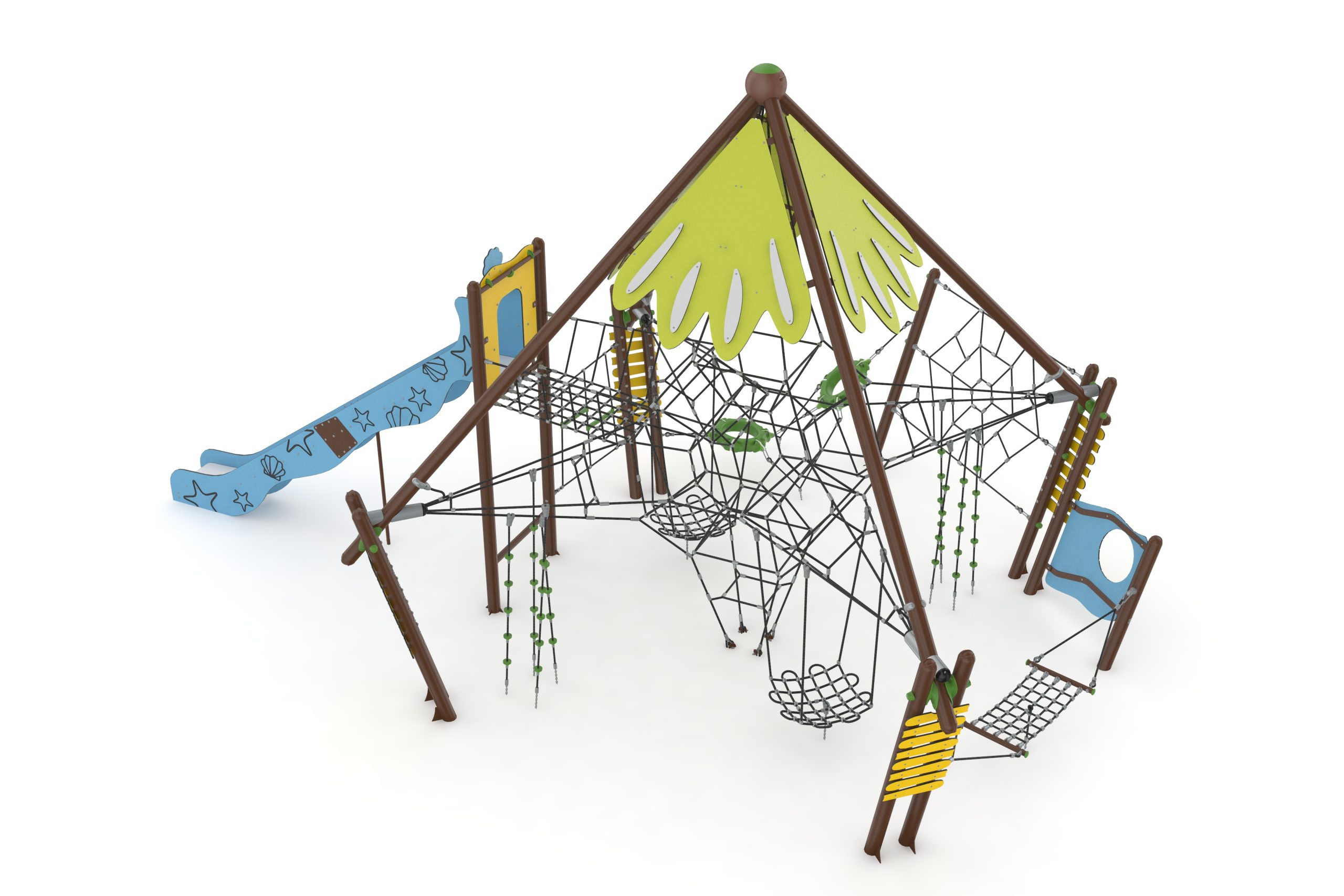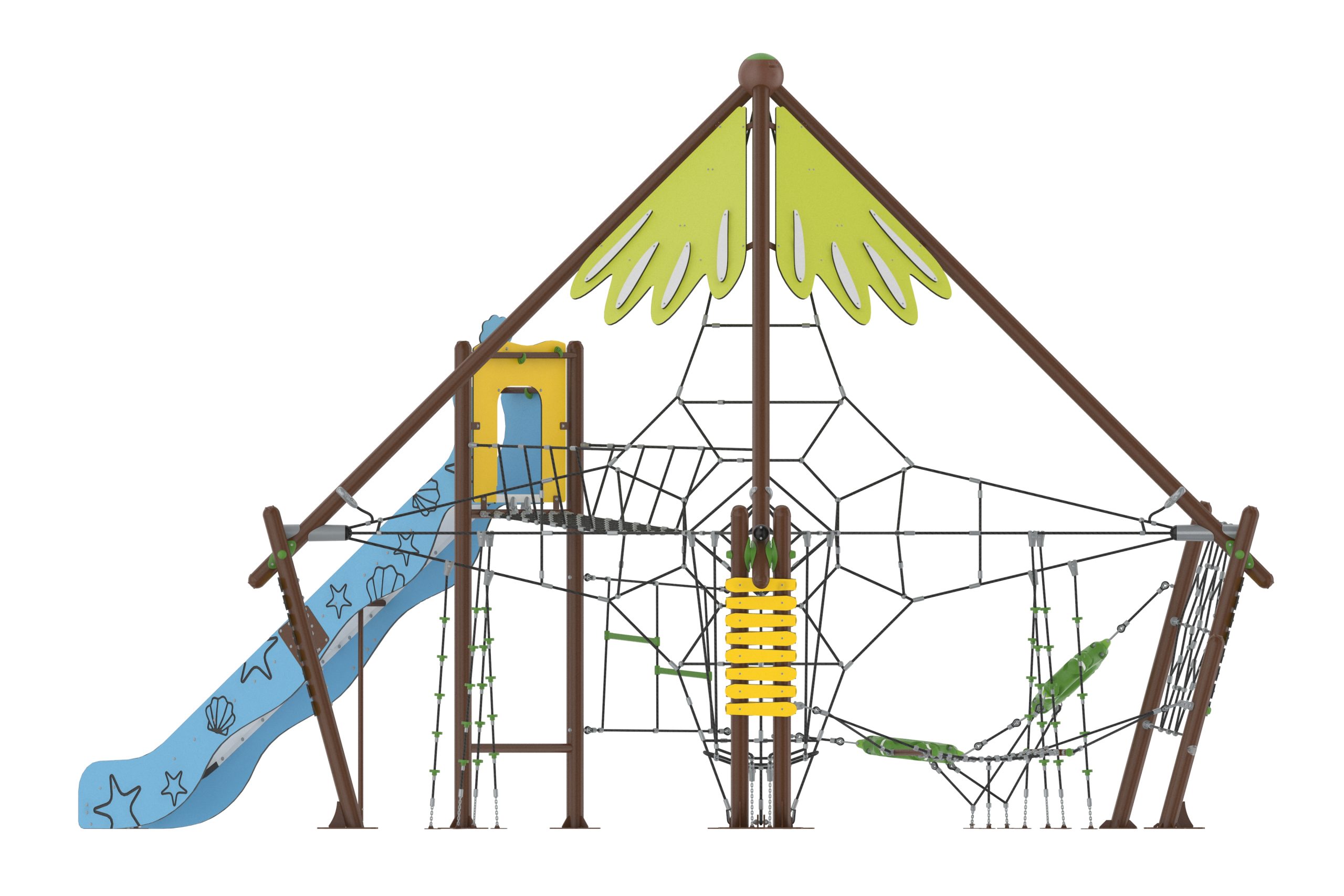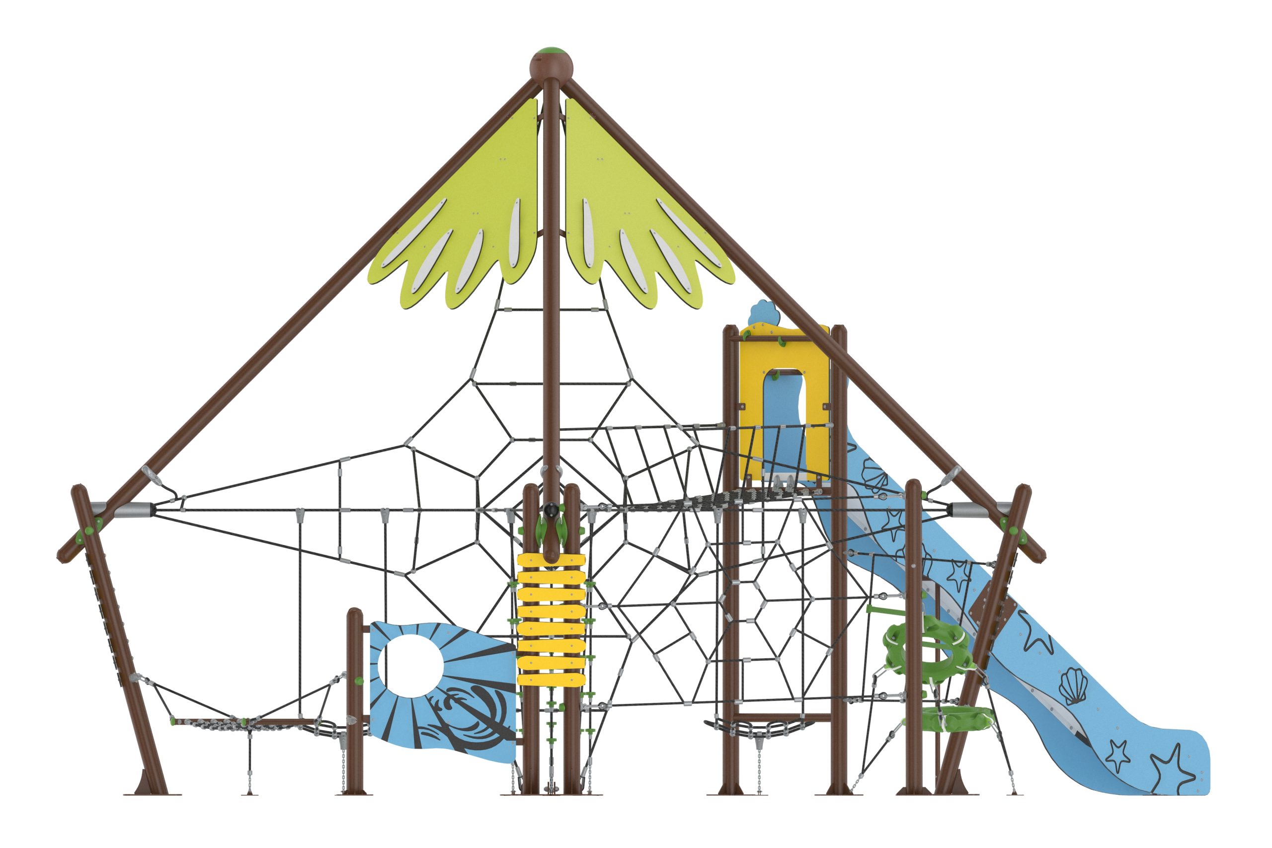 Aloha Hawaii Series! Inspired by a tropical concept, this product line features a vibrant island theme. Each equipment in the series represents an island setting, complete with various play stations and 3D rope climbing structures. These interconnected play stations form a circular layout around the central 3D rope climb. Designed to immerse children in an island atmosphere, the themed game units encourage imaginative role-playing and creativity, utilising the open spaces within the structures.
