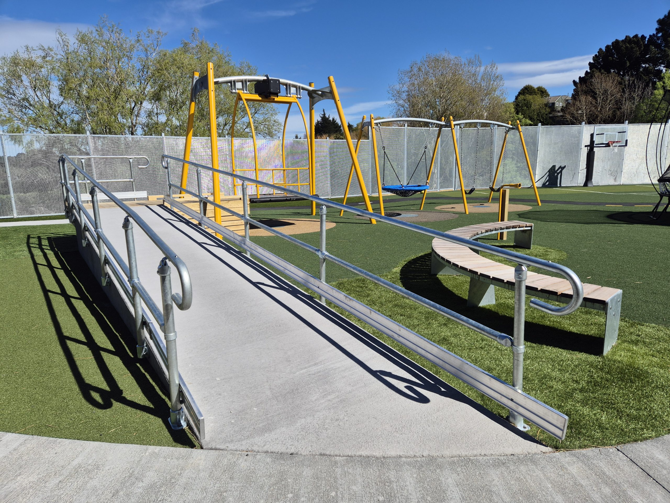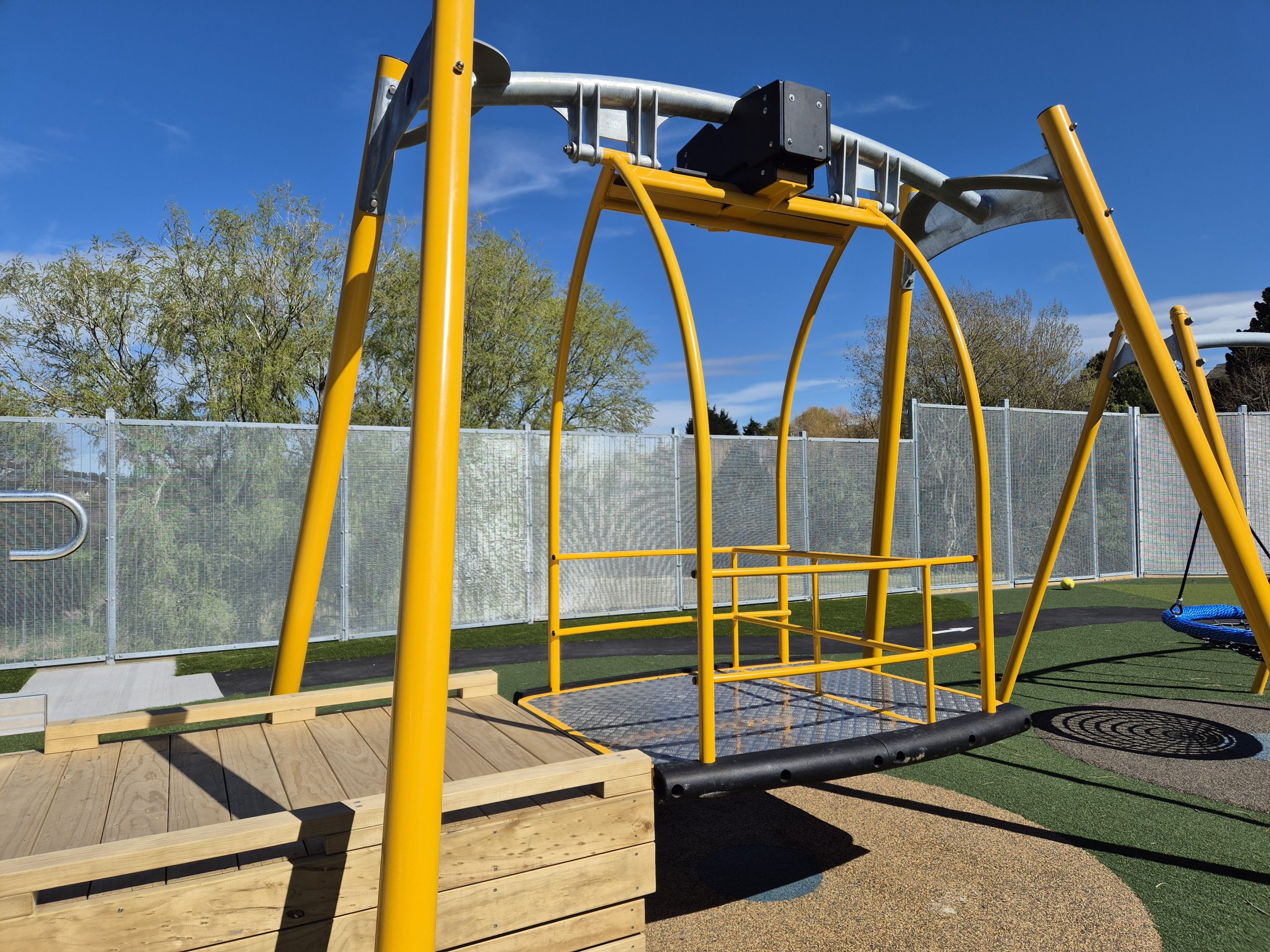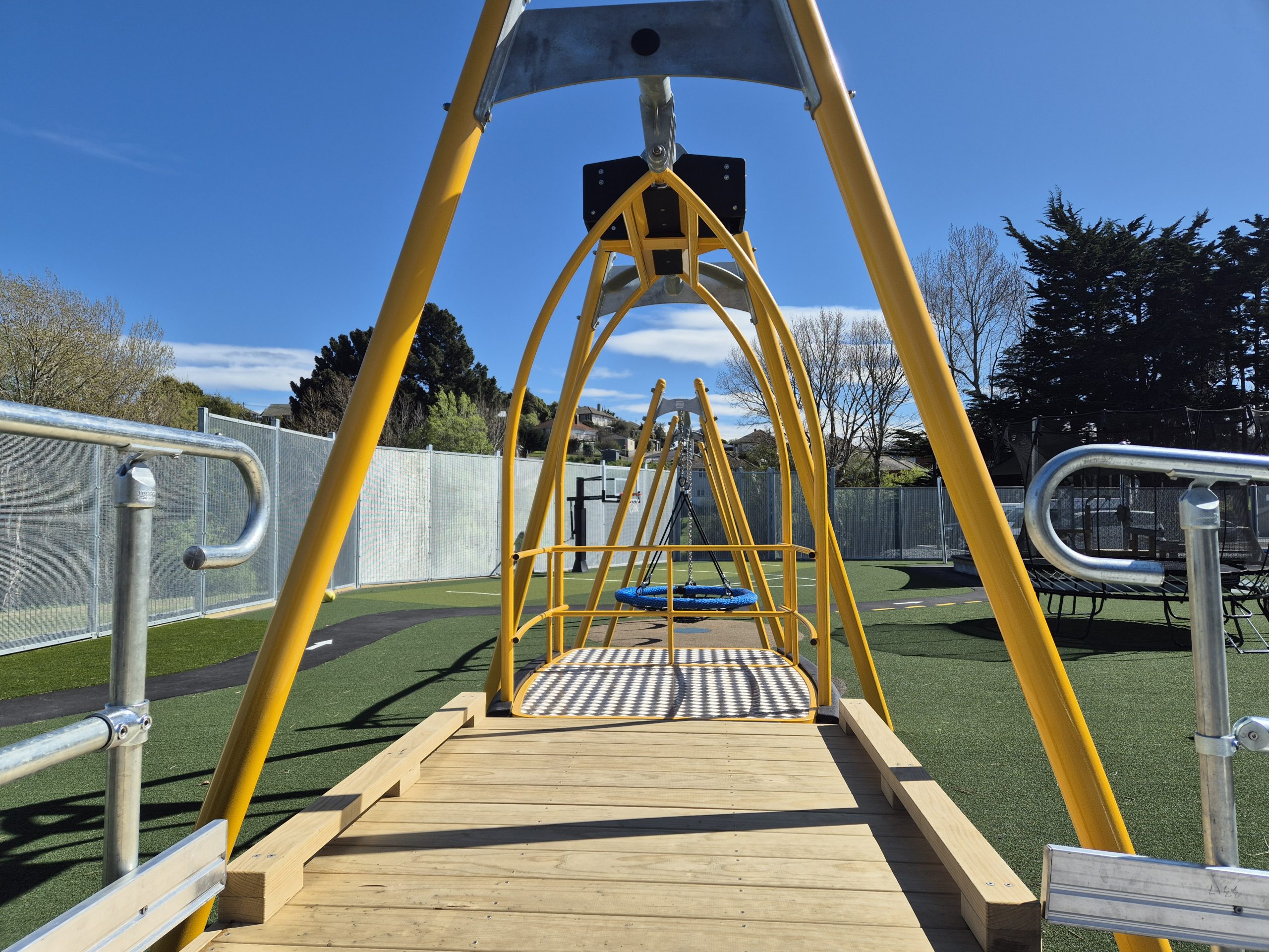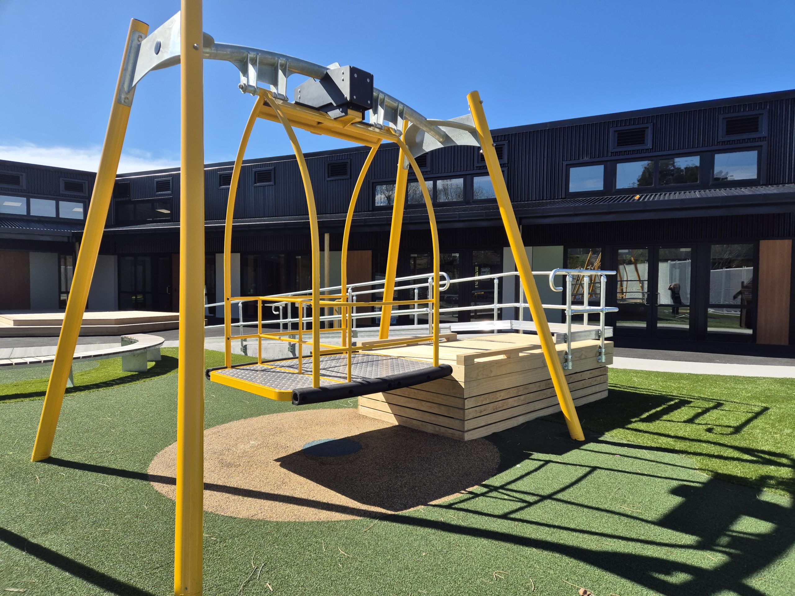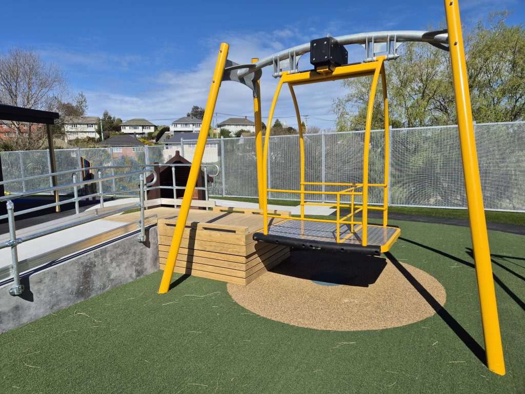 The Inclusive Swing by Playground Centre is a high-quality accessible swing designed to support inclusive play in parks, schools, and community spaces across New Zealand and Australia. Built with a spacious, anti-slip platform and supportive wrap-around rails, this inclusive swing allows wheelchair users, mobility-device users, and carers to roll on easily and enjoy a shared swinging experience with confidence.