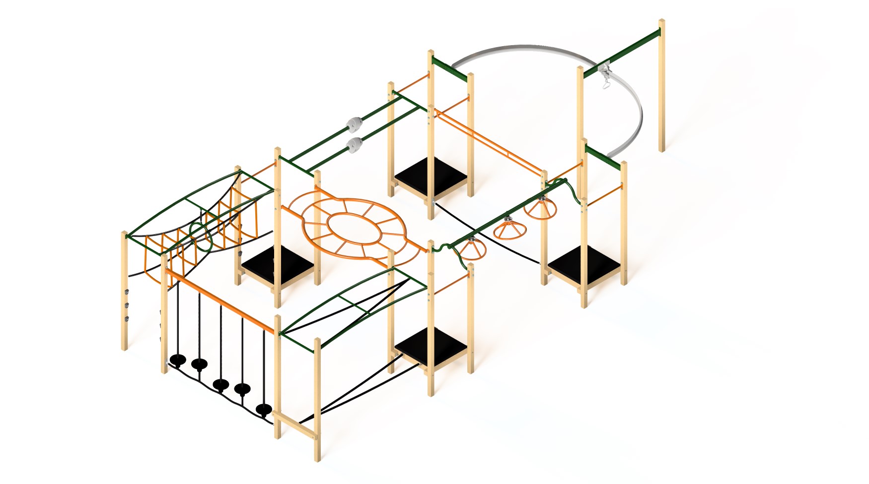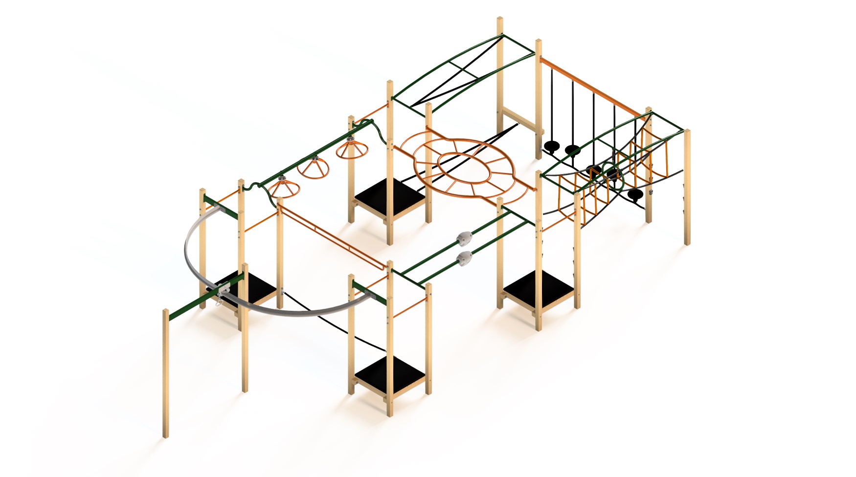 The Jungle 403 is an action packed playground featuring our 180° Aeroglide and our Twist & Turn. Add a mix of flexible bridges and overhead activities to these and you have an excellent playground!