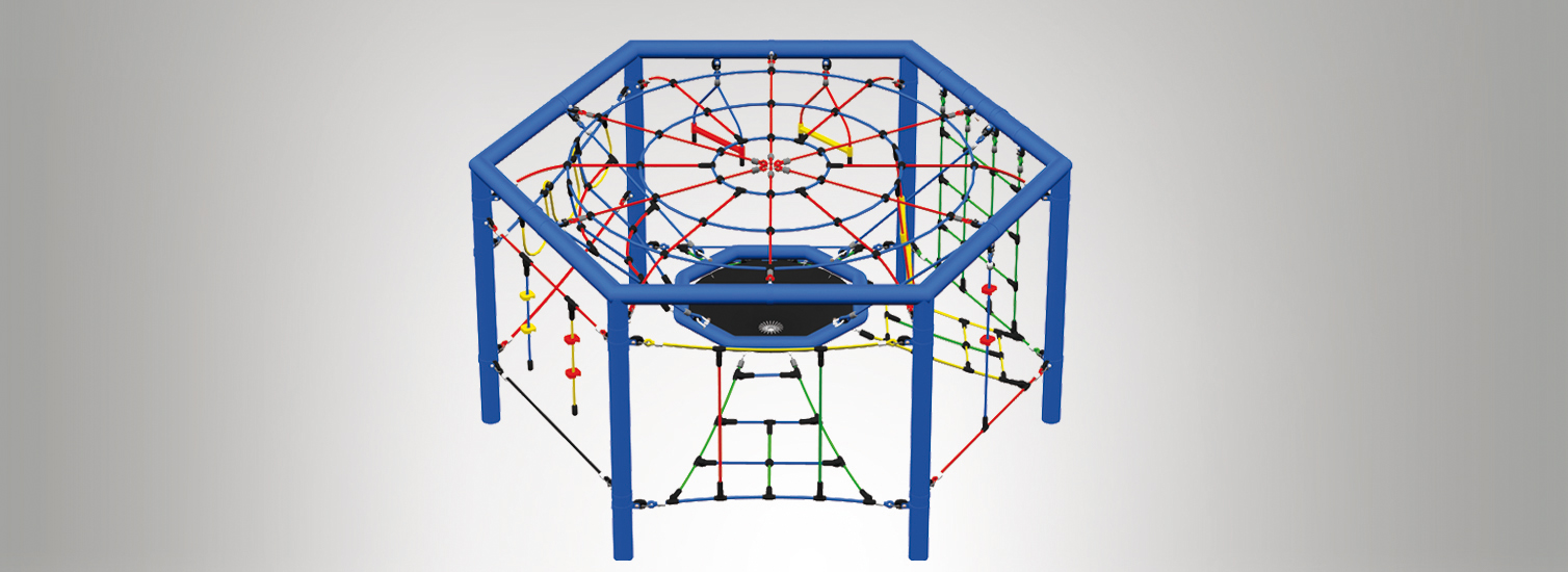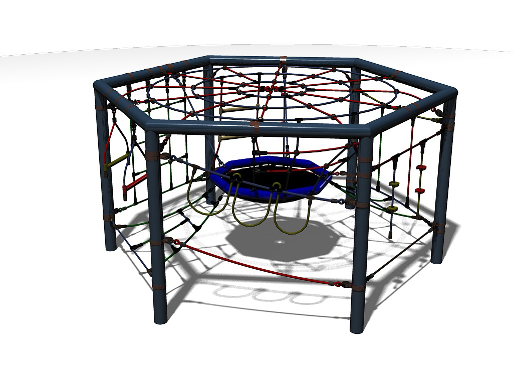 1.6m high hexagonal-shaped unit with a range of activities including Spider-web net, Mini nest basket in centre, Trianglular climbing nets, garland clamber rope, climbing ladder, suspension ropes with balancing ropes.