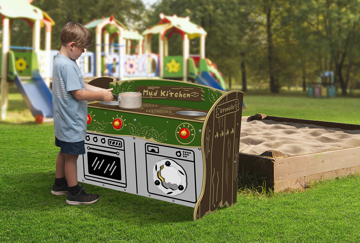 Making mud pies and serving them to your friends is part of any kids childhood. Playground Centre has just made this a whole lot more fun with our new mud kitchen. This kitchen is now available with two removable mud bowls, integrated utensil hooks and an interactive washing machine game with ball bearings.