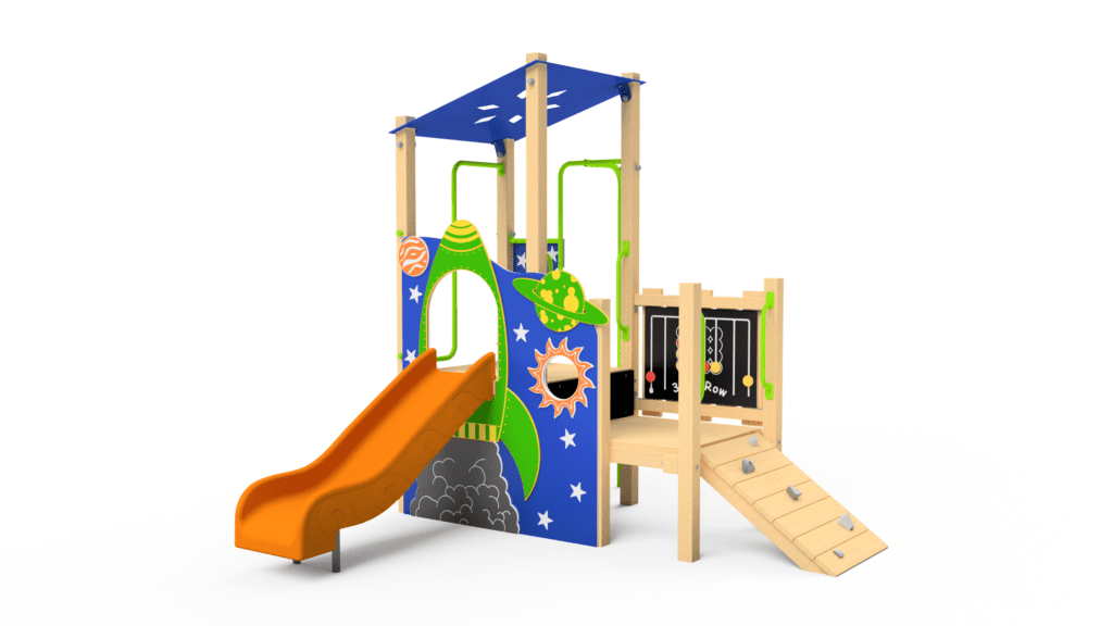 The activities on the Rocket Launch 164 are suitable for very young children, and the playground module as a whole is very low-lying. This also makes supervising young children on the playground an easier task. Extra theming is added with the space themed ultratuff panel to stimulate imaginative and creative play.