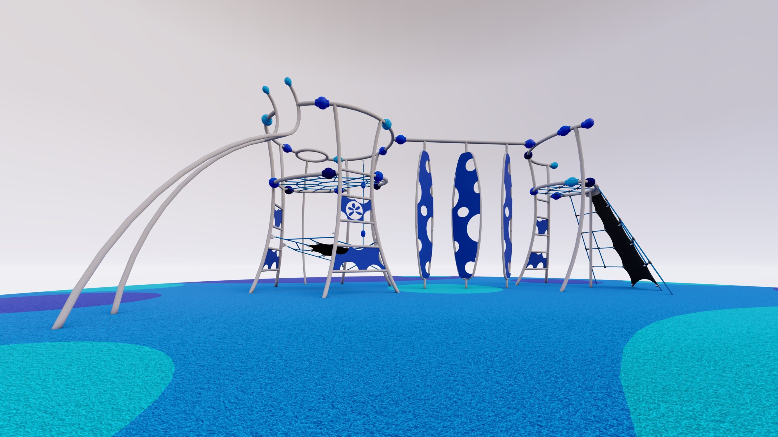 The Titan series has a fantastic futuristic architectural styling. It’s the perfect blend of subtle natural forms with adventurous challenges. Titan Three Unit with a gladiator net at lower level for all inclusive play.