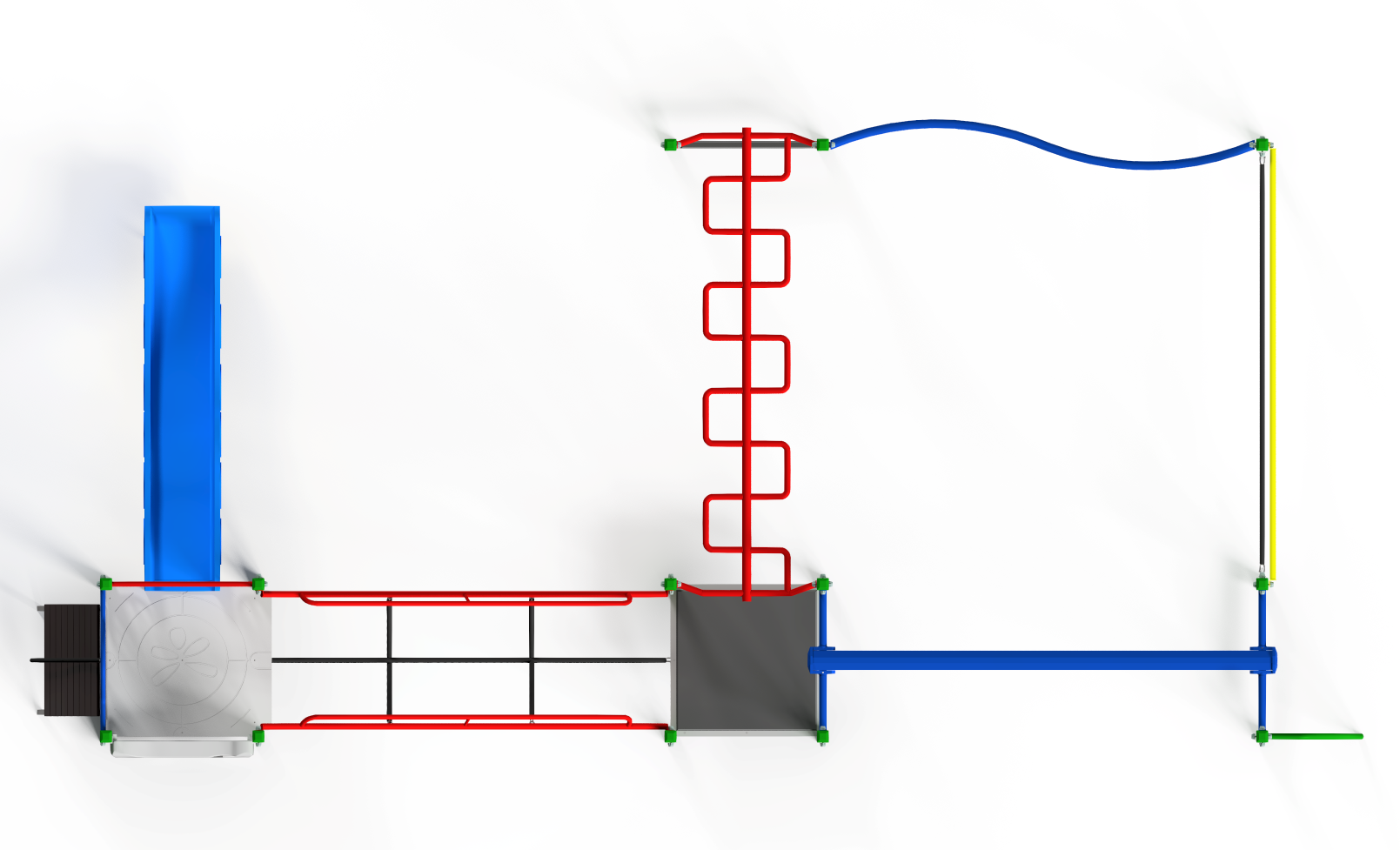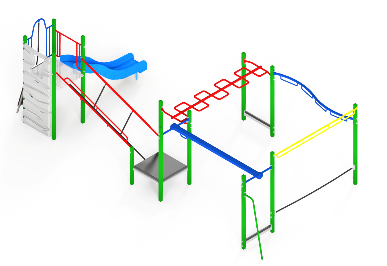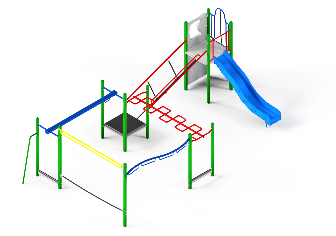 A compact, fitness orientated playground for a lower budget, ideal for a small area or small school.  Includes all the essential play elements – Sliding, Overheads, Balance & Climbing.