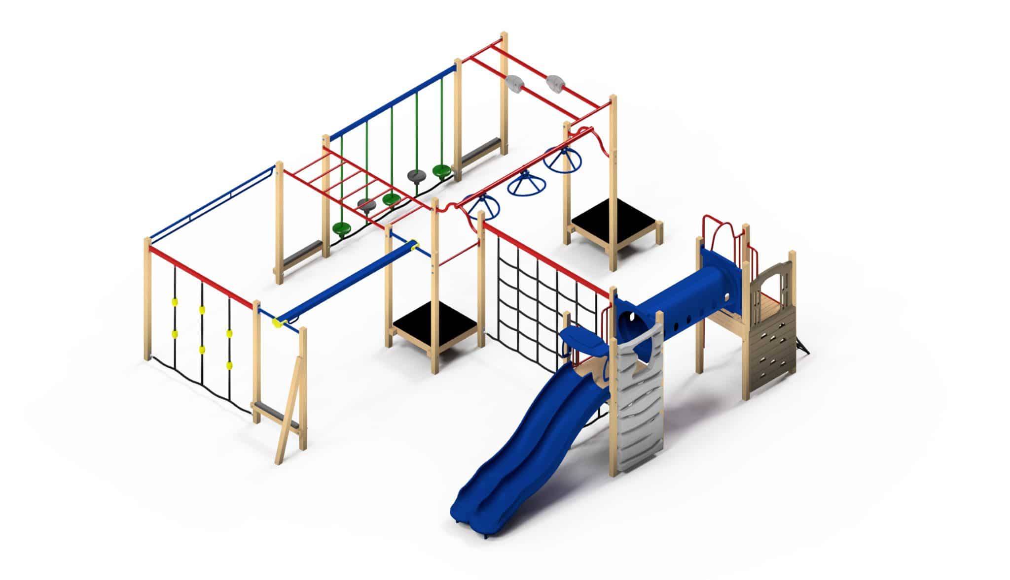 A real good all-rounder, traditional playground which features a whole range of climbing, upper body, balance and sliding movements for the complete range of age groups. Added benefits of a circuit style allows enhanced competitiveness and creativity.