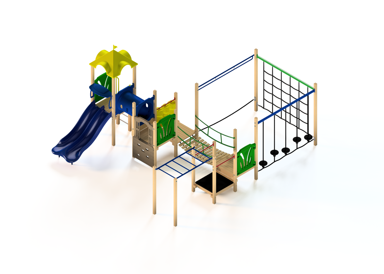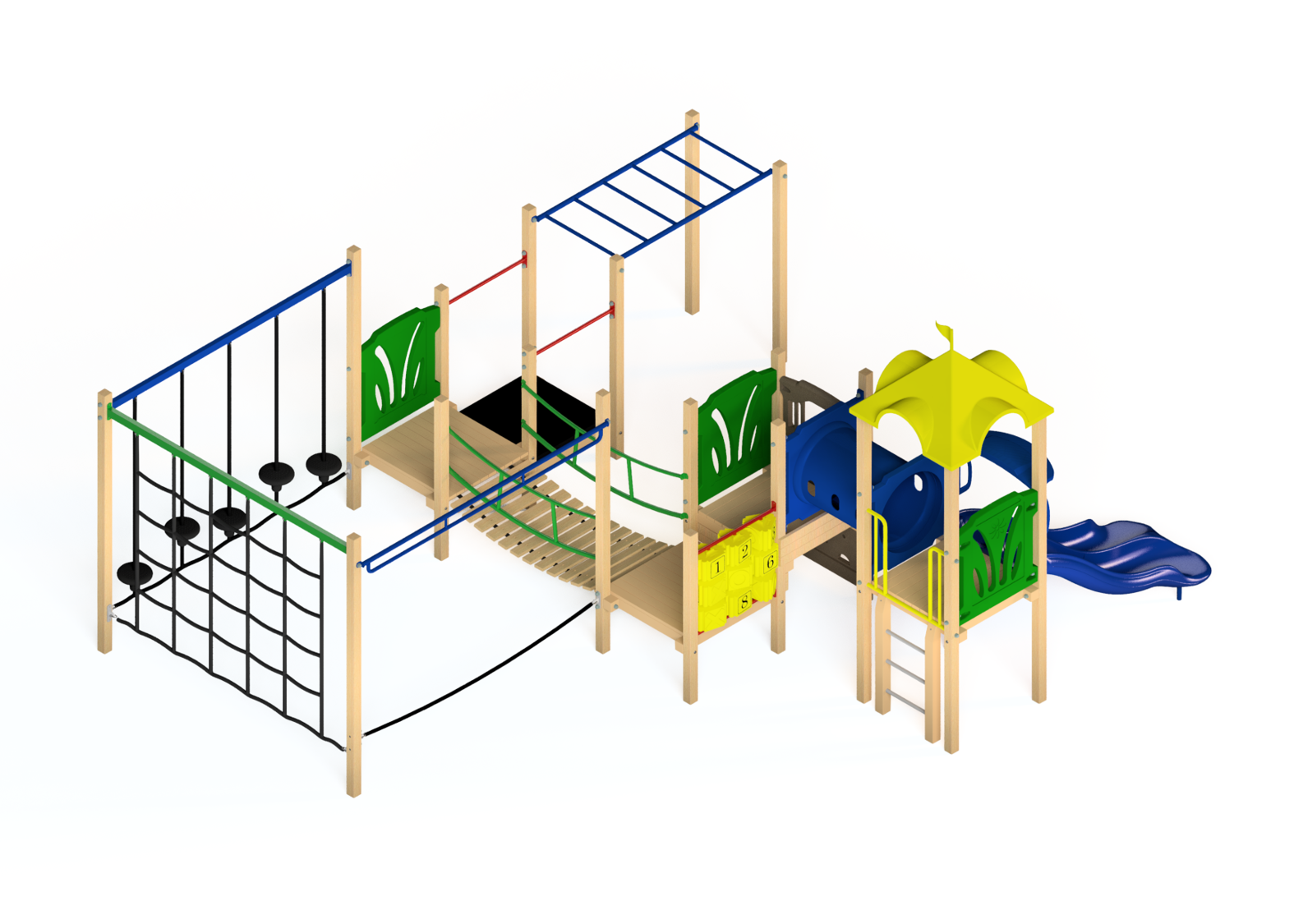 Packed with play value, includes all the popular items, starting with toddlers & younger Kids – Double Slide, Crawl Tunnel, Kiwi Numbers Panel, Ladders, Slat Sway Bridge, leading up to the challenging activities that test those balance, climbing & upper -body strength muscles, such as Commando Net, Stepping Stones, Hanging Rings & Monkey Bar …