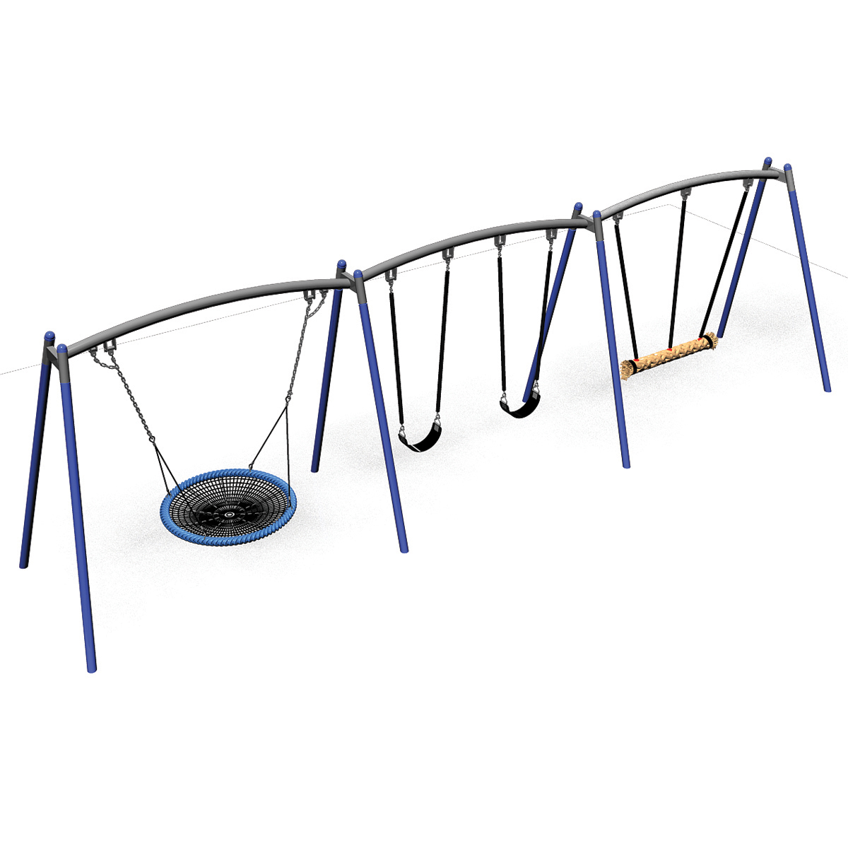 Swing alongside with 2 standard swings on the same frame. Attractive top bar curves for strength. Top bar set at 2.2m above surface level.