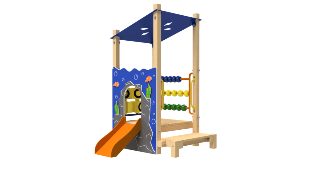 The activities on the Underwater World 163 are suitable for very young children, and the playground module as a whole is very low-lying. This also makes supervising young children on the playground an easier task. Extra theming is added with the underwater themed ultratuff panel to stimulate imaginative and creative play.