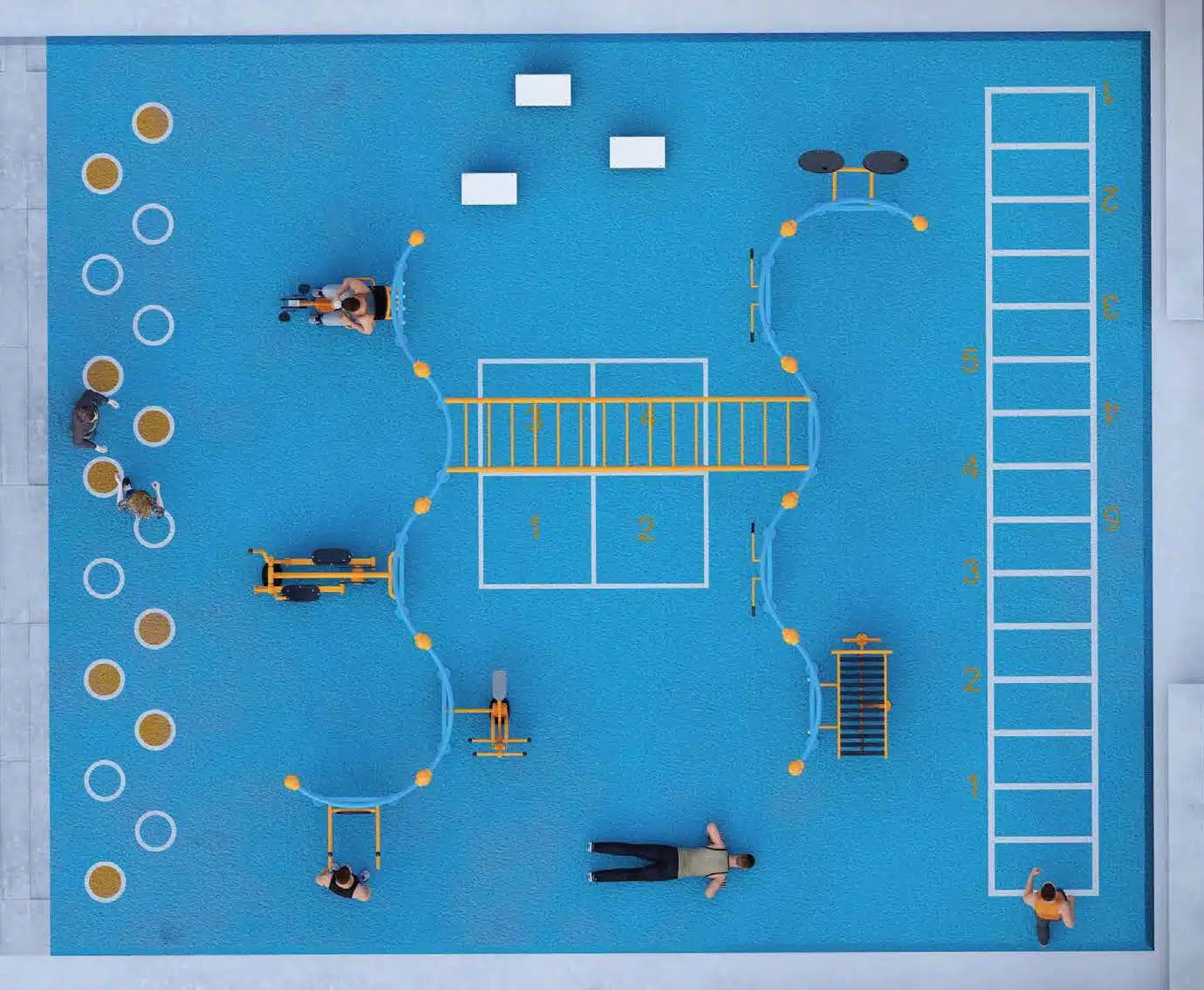 This compact gym really packs a punch, with a clever cluster of equipment for full-body benefits, a mix of cardio and muscle strengthening, and ample space for cross-training and unstructured exercise. All that, along with the possibility of incorporating an adjacent bike rack and shelter, means this gym really outperforms.