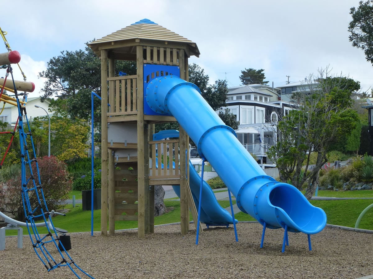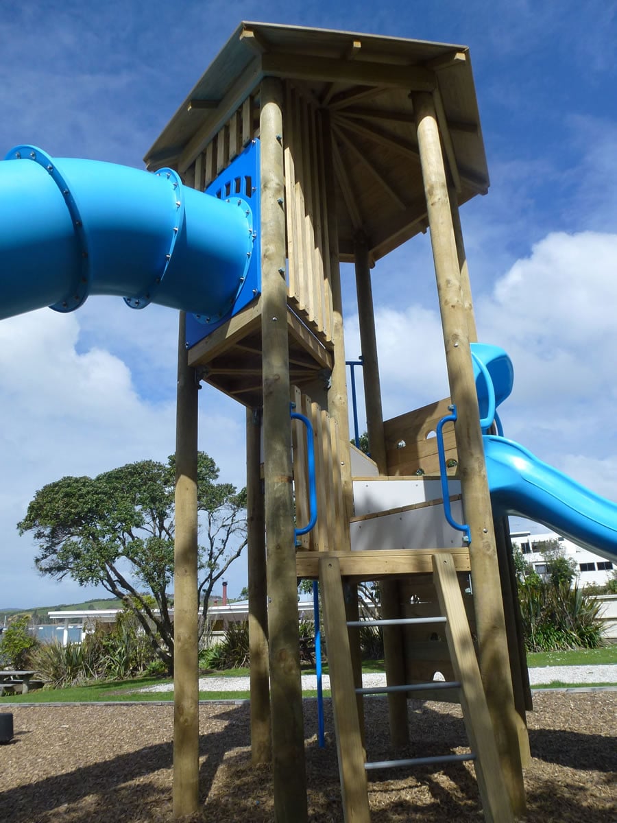 Playground Centre worked to create a unique tower which had internal play levels within. The tower needed to handle a large age range. Passive barriers were added to provide challenge to get to the tube slide at the top. Colour was used to enhance the coastal theme.