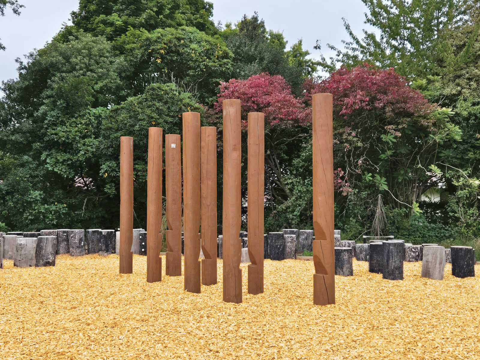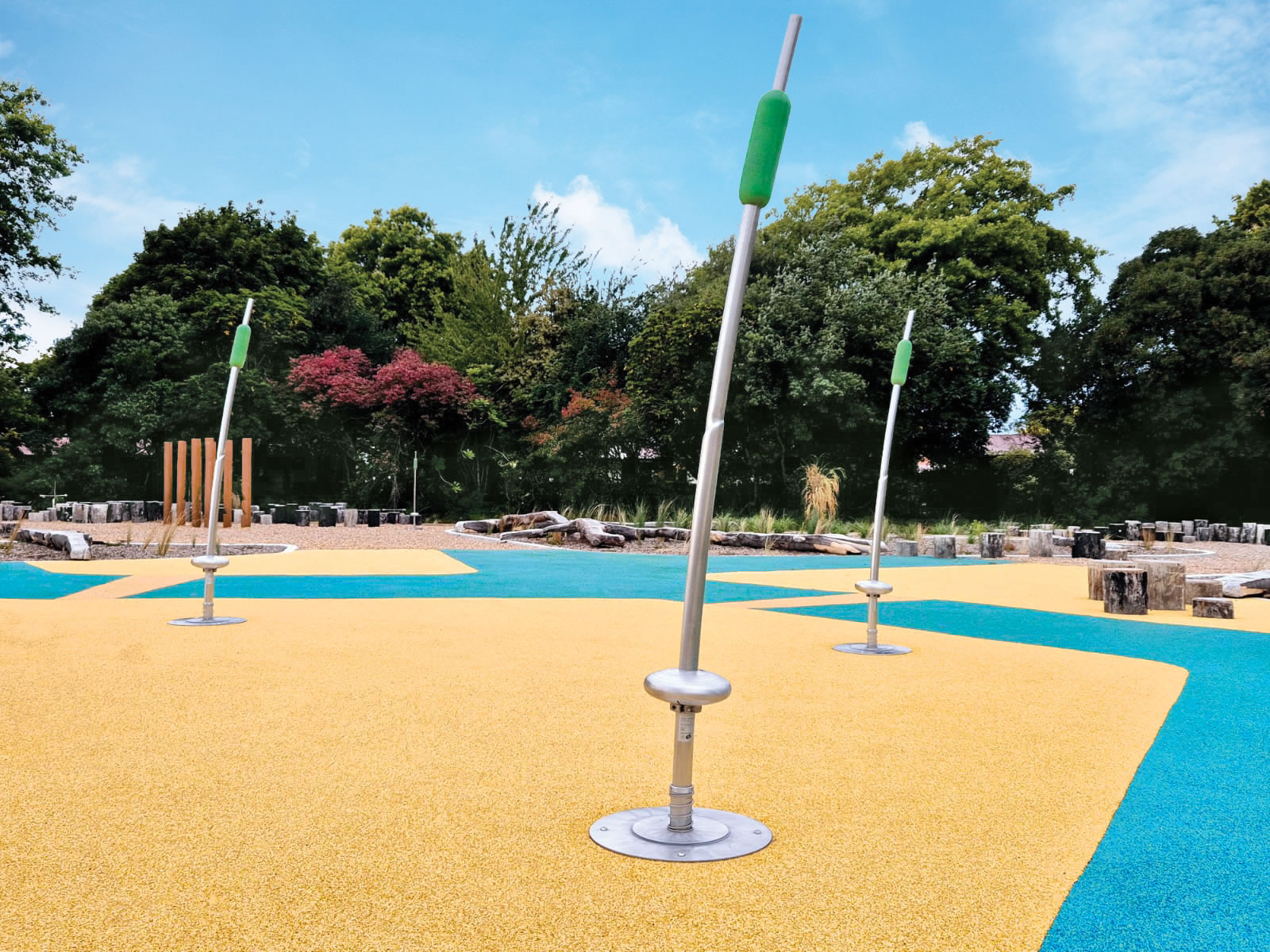 • Grass (exclusive to Playground Centre in New Zealand) – These cattail‑shaped poles mirror riverbank grasses and are dotted throughout the playspace for park-goers to climb, swing and spin on.