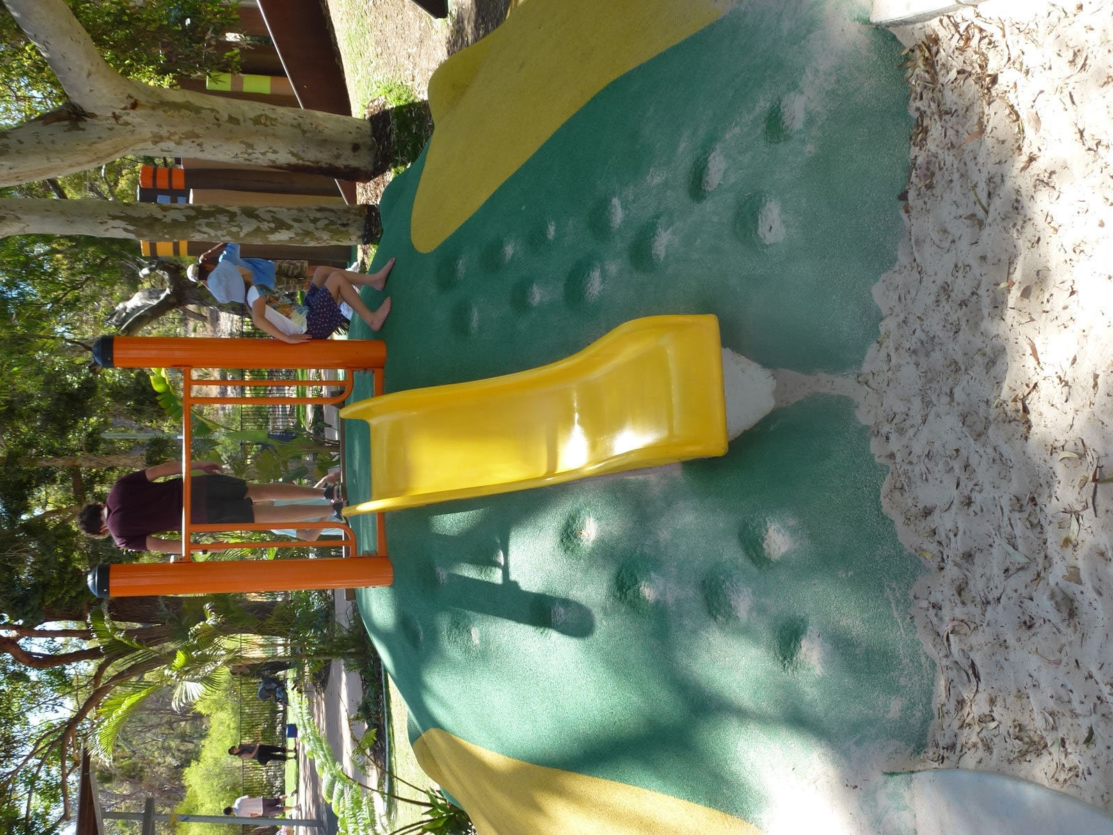 The slide was positioned on an artifical mound, with a timber set of steps. The mound created a screen to a sand pit featuring a giant turtle sculpture – adding to the joy of discovery. Our in-ground trampolines added a fun opportunity to bounce and be used in imaginative games.