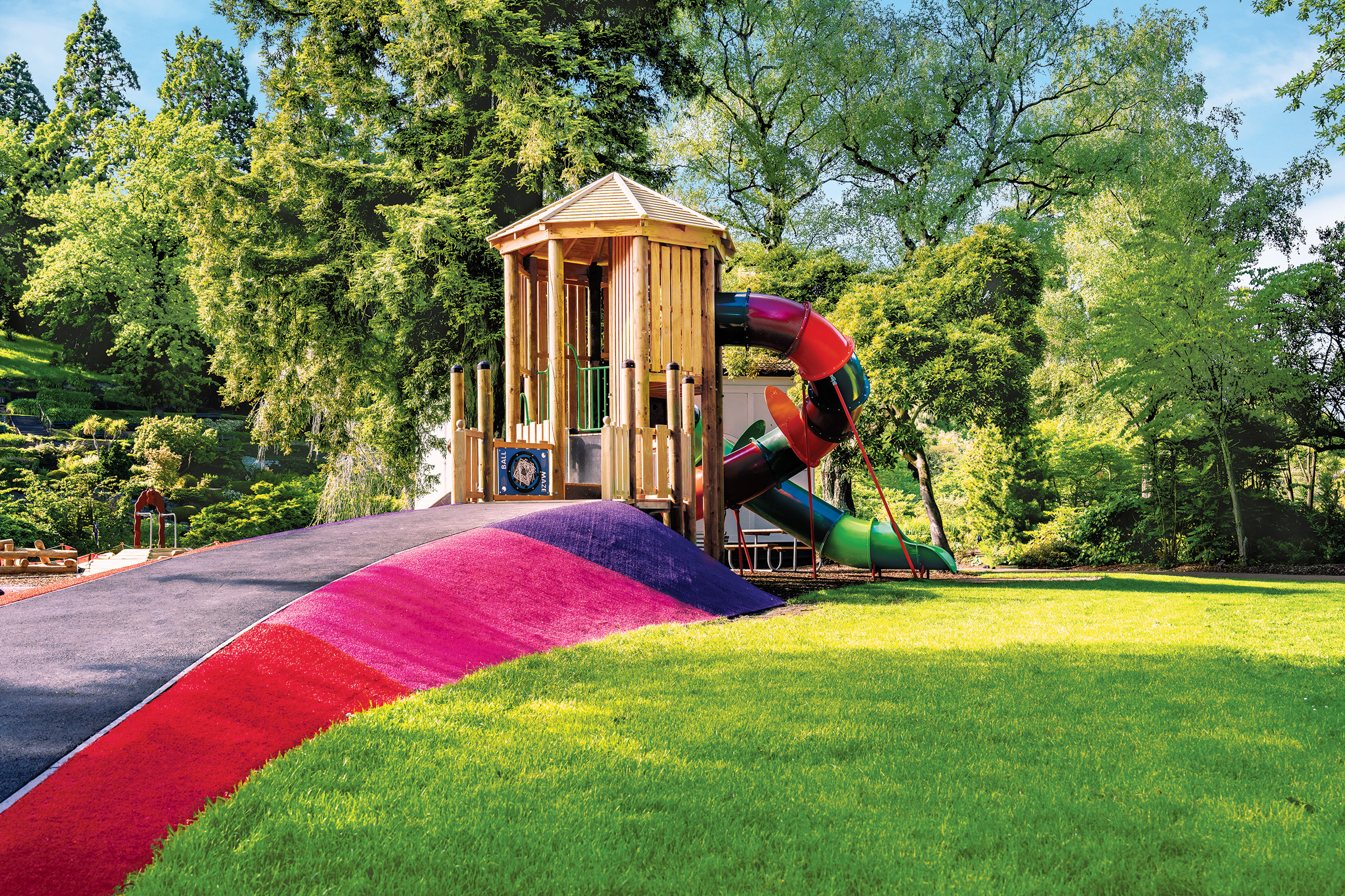 Playground Centre partnered with Dunedin City Council to design and deliver the playground, including bespoke equipment and installation. Bright soft-fall surfacing paired with natural bark soft-fall surfacing, and timber play structures, gives the space a fun, welcoming feel that sits beautifully within its garden setting.