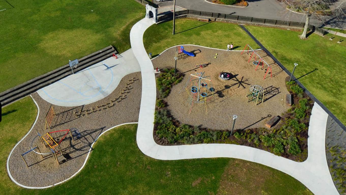 Playground Centre worked with the Local Board, Council, Project Manager and Contractor to achieve this awesome Park. The Local board were initially consulted on their vision to design a playground would reflect the character of Te Puke and be unique. Given the large and ambitious Walkway refurbishment, from the main street to the park. We worked with the Architect/Project manager to create options and ideas to fit concept, site and budget. The 6m Tower with nests gives a kiwifruit vine impression as the centre of activity with an array of round shaped components and complimentary pieces. Encouraging more people into the park also increased the safety and security.