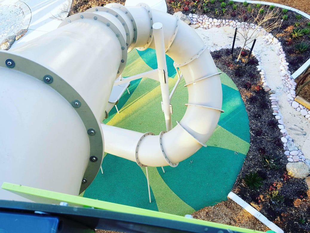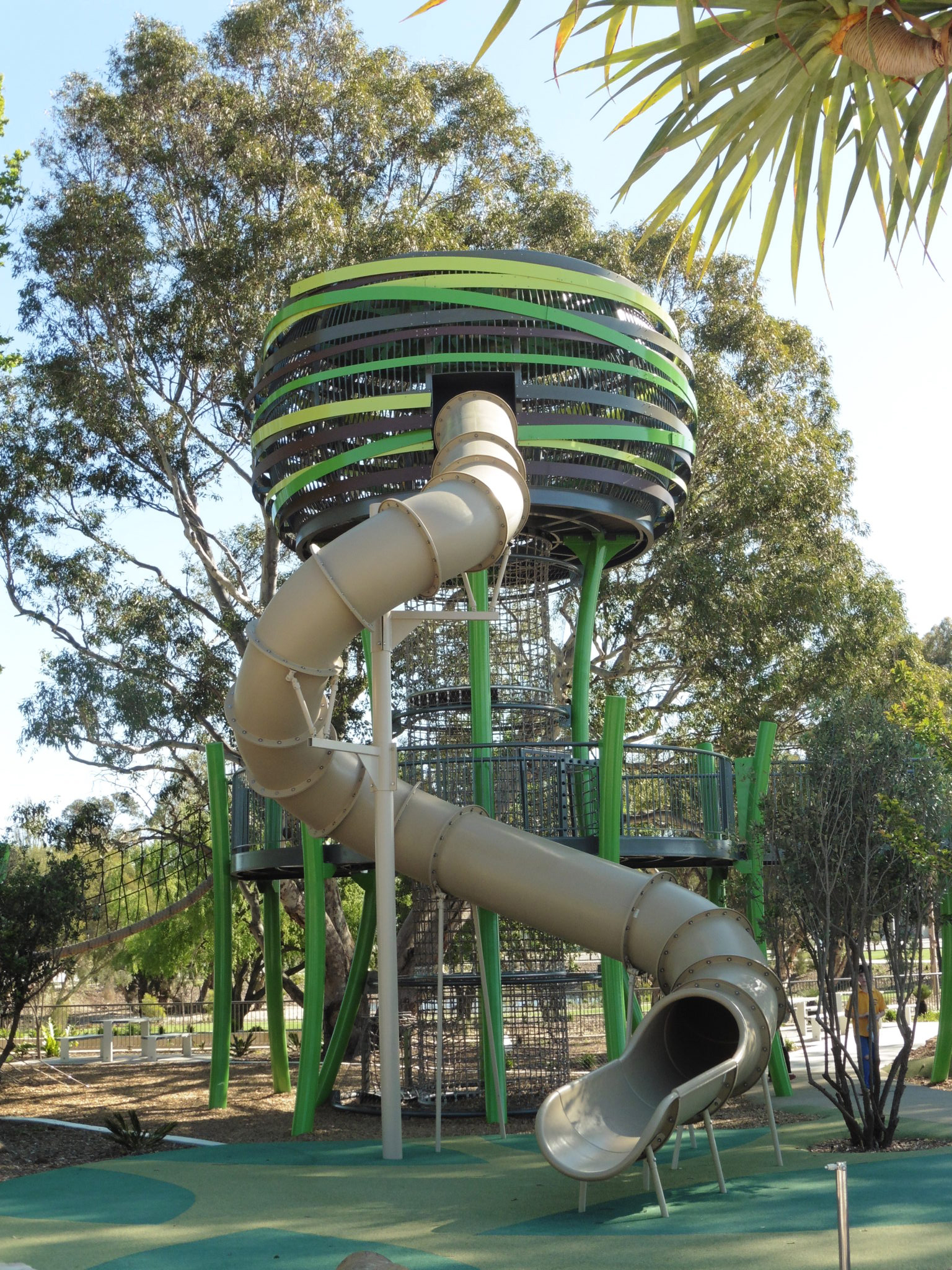 Respecting the natural environment and blending with existing land contours and established trees was equally important. A body of water sits beautifully among established trees. Huge Huck ropes mimic jungle vines while a 7m tall climbing tower with a bird’s nest top adds to the natural theme. Connected to the tower is an enclosed sectional tube slide that was created to the architect’s specification. A local engineering company constructed the tower and we worked closely with the architect at every step to ensure the tower and slide would fit perfectly in the area.