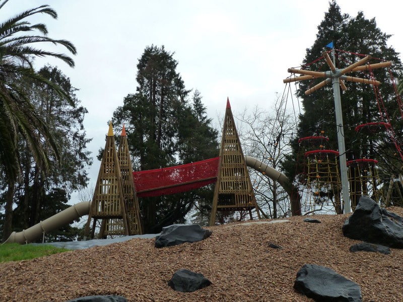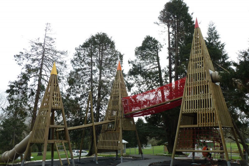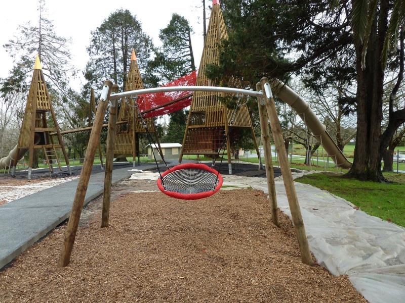Playground Centre worked with the Auckland Council to design an open plan playground on a raised central knoll, surrounded by trees and a pedestrian pathway. Play pieces such as towers and an eagle’s nest were specifically chosen to elevate users to eye level with the tree tops. Installed slides and flying foxes also took advantage of the existing contours with the new playground offering outdoor recreation for the whole family and a physical challenge.