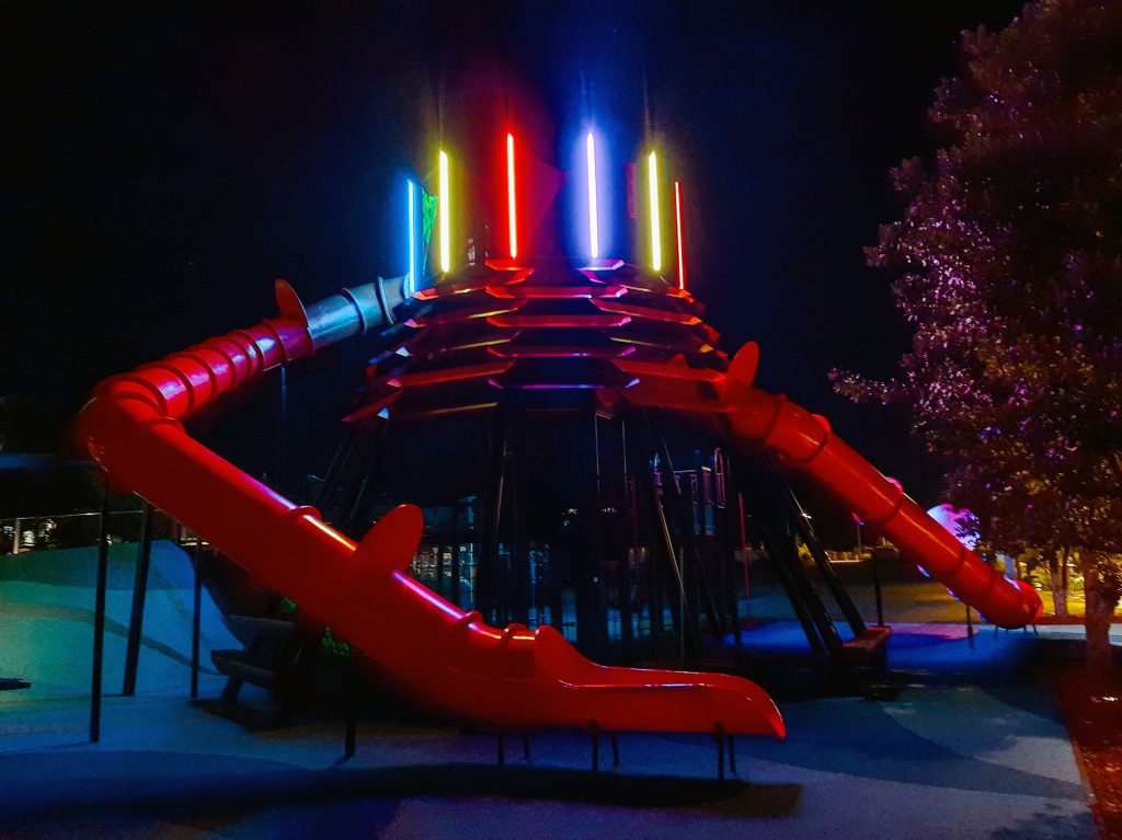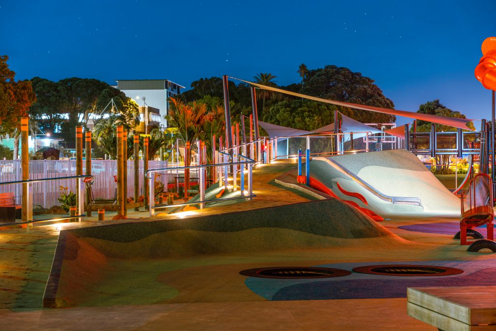 Adding a touch of magic to this play space in the evening, LED lighting illuminates different play elements, including the Waka Tower and Milky Way elevated pathway. This not only creates a striking after-dark aesthetic but introduces the opportunity for play into the evening for local and visiting families.