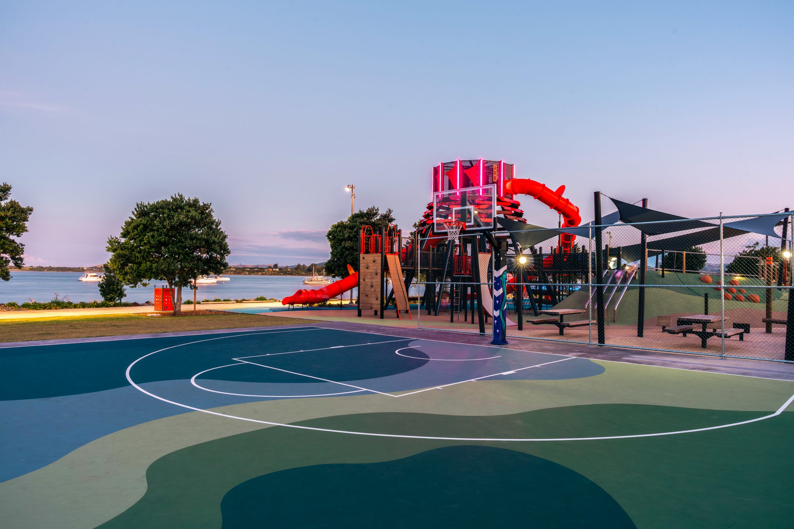 At its heart stands the Waka Tower, a striking tribute to the arrival of the Tākitimu waka (canoe) in Tauranga moana (harbour) which, according to legend, landed near the site of the playground after the long journey from Hawaiki. Inspired by the celestial navigation techniques used by early Māori explorers and European settlers, the playground incorporates Matariki star constellations etched amongst the Milky Way stars on the elevated walkway, symbolising the guiding lights that led explorers to the shores of Tauranga.